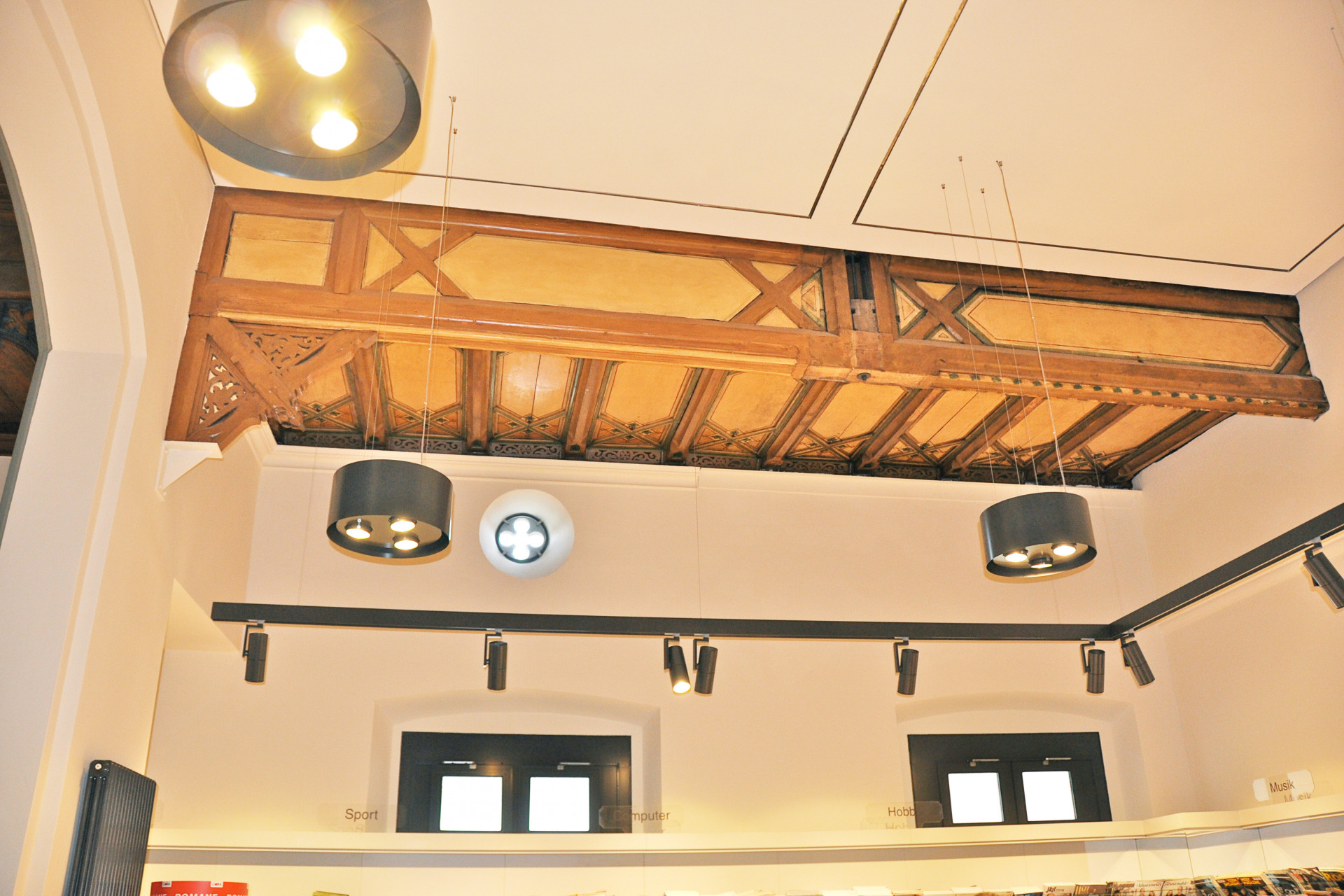 Während der Durchführung des Abbruchs und umfangreicher statischer Eingriffe wurden verloren geglaubte bauzeitliche Deckenelemente freigelegt und denkmalgerecht in Stand gesetzt.
