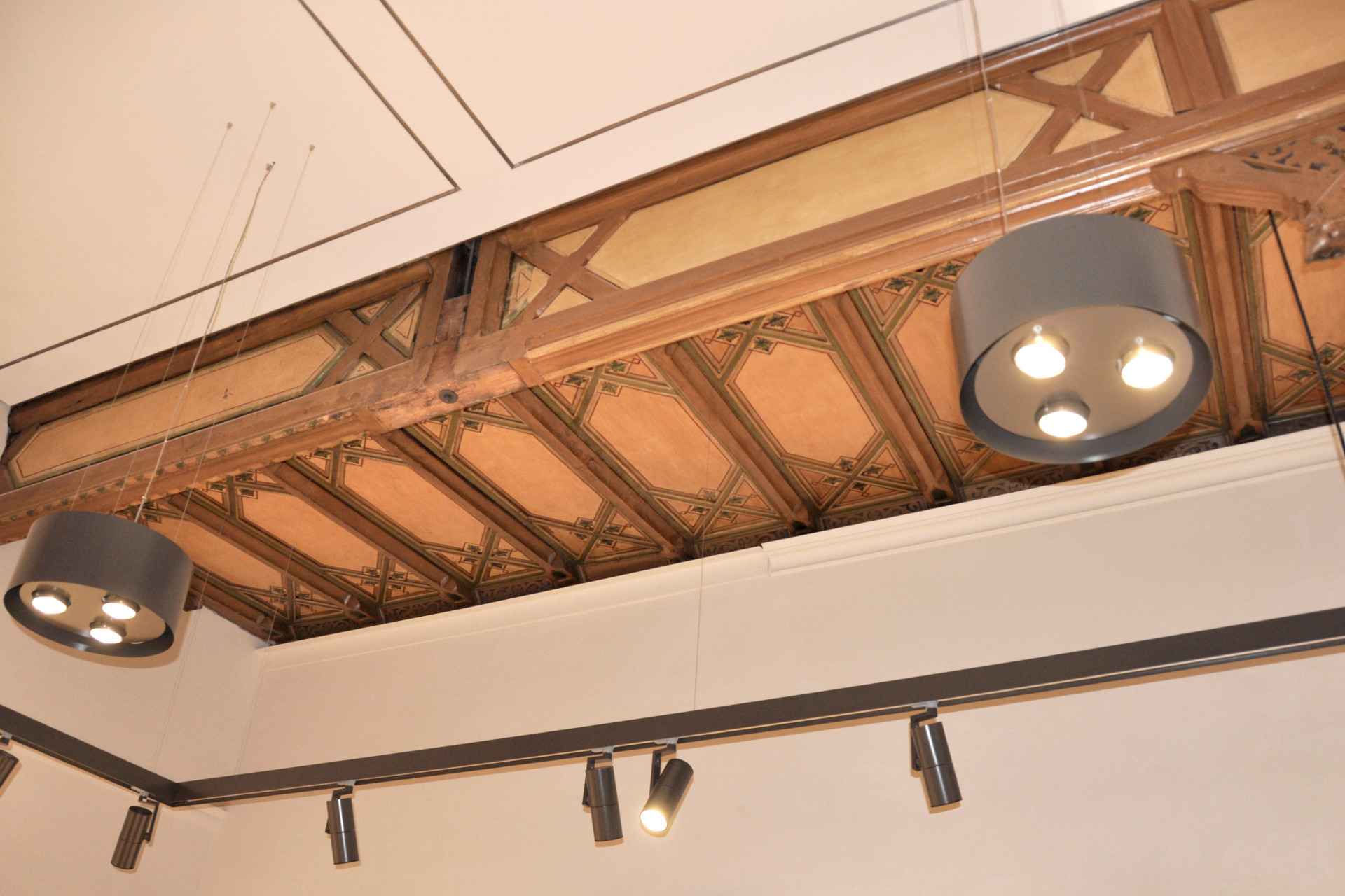 Während der Durchführung des Abbruchs und umfangreicher statischer Eingriffe wurden verloren geglaubte bauzeitliche Deckenelemente freigelegt und denkmalgerecht in Stand gesetzt.